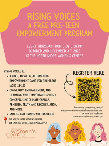 The North Shore Women's Centre is a Drop-In Resource Centre located on the traditional and unceded territories of the Squamish and Tsleil-Waututh Nations, serving women, girls, and gender-diverse individuals in the whole of the North Shore since 1973. By operating a welcoming and inclusive Drop-In Resource Centre, we offer a wide variety of free programs, services, and resources to help empower women from different backgrounds and experiences through feminist perspectives.